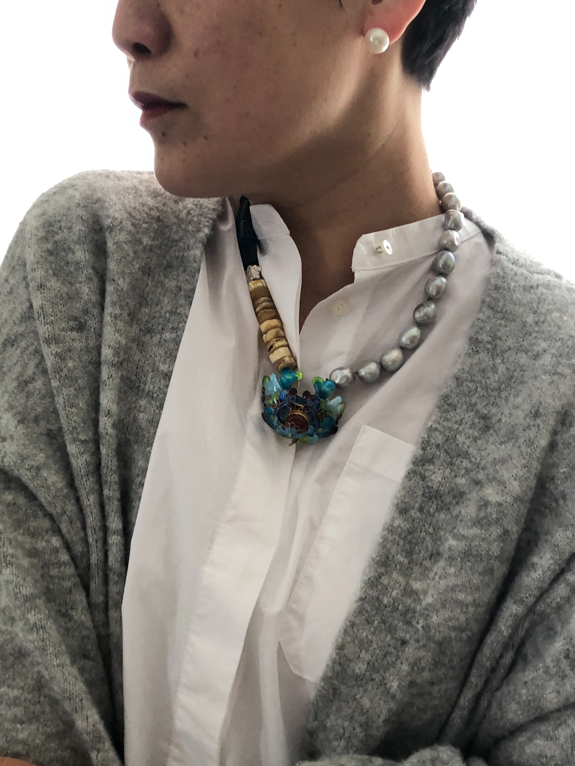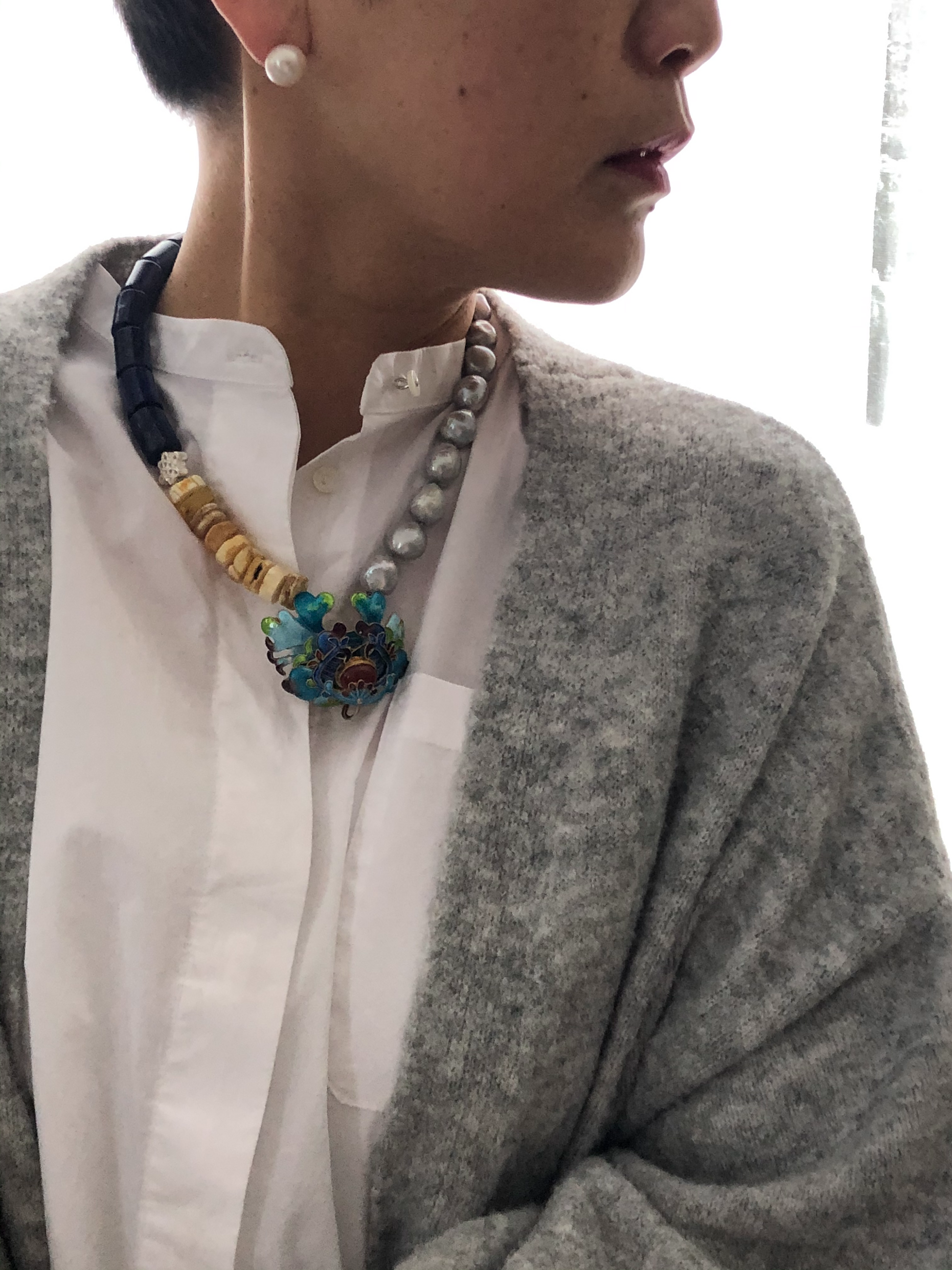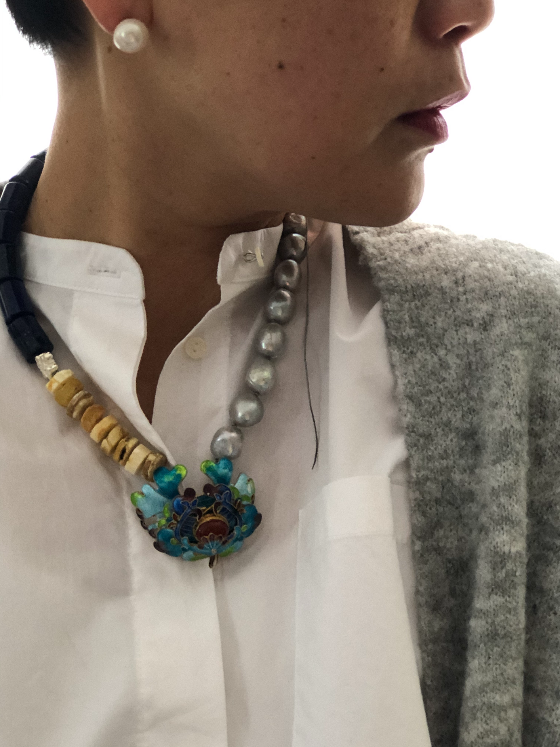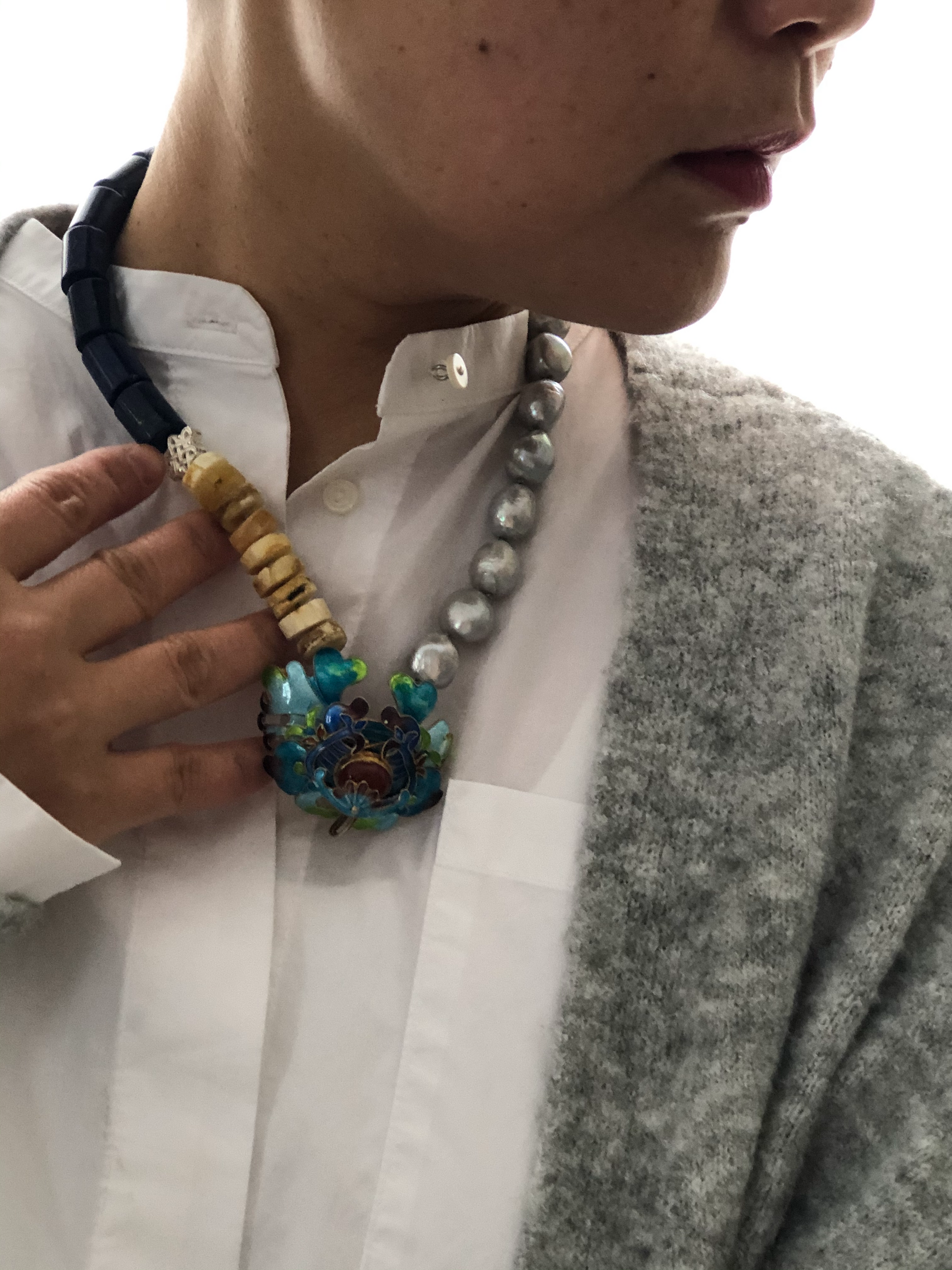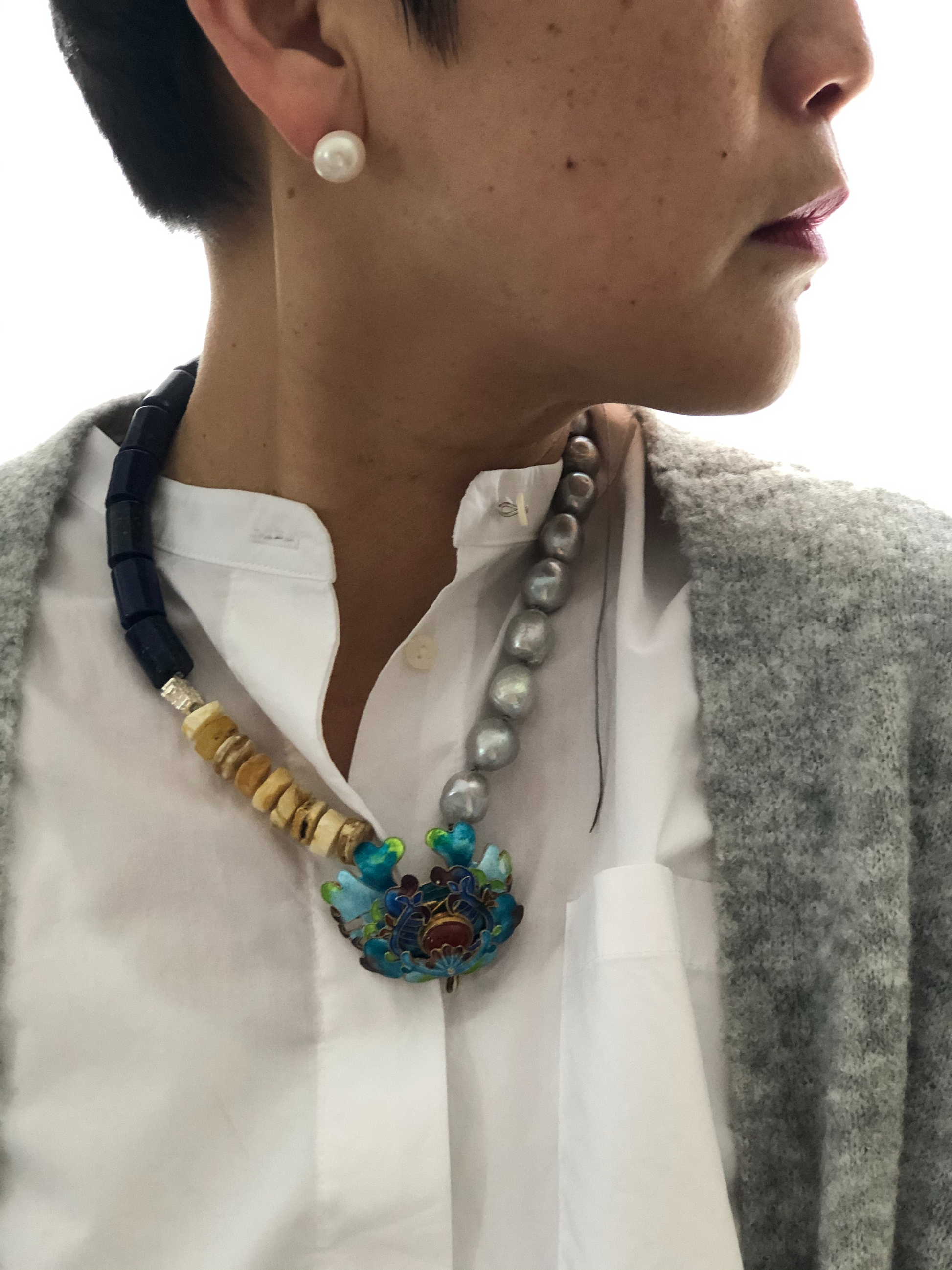 Materials : Baltic amber, lapis, fresh water pearl , silver enamal pendent