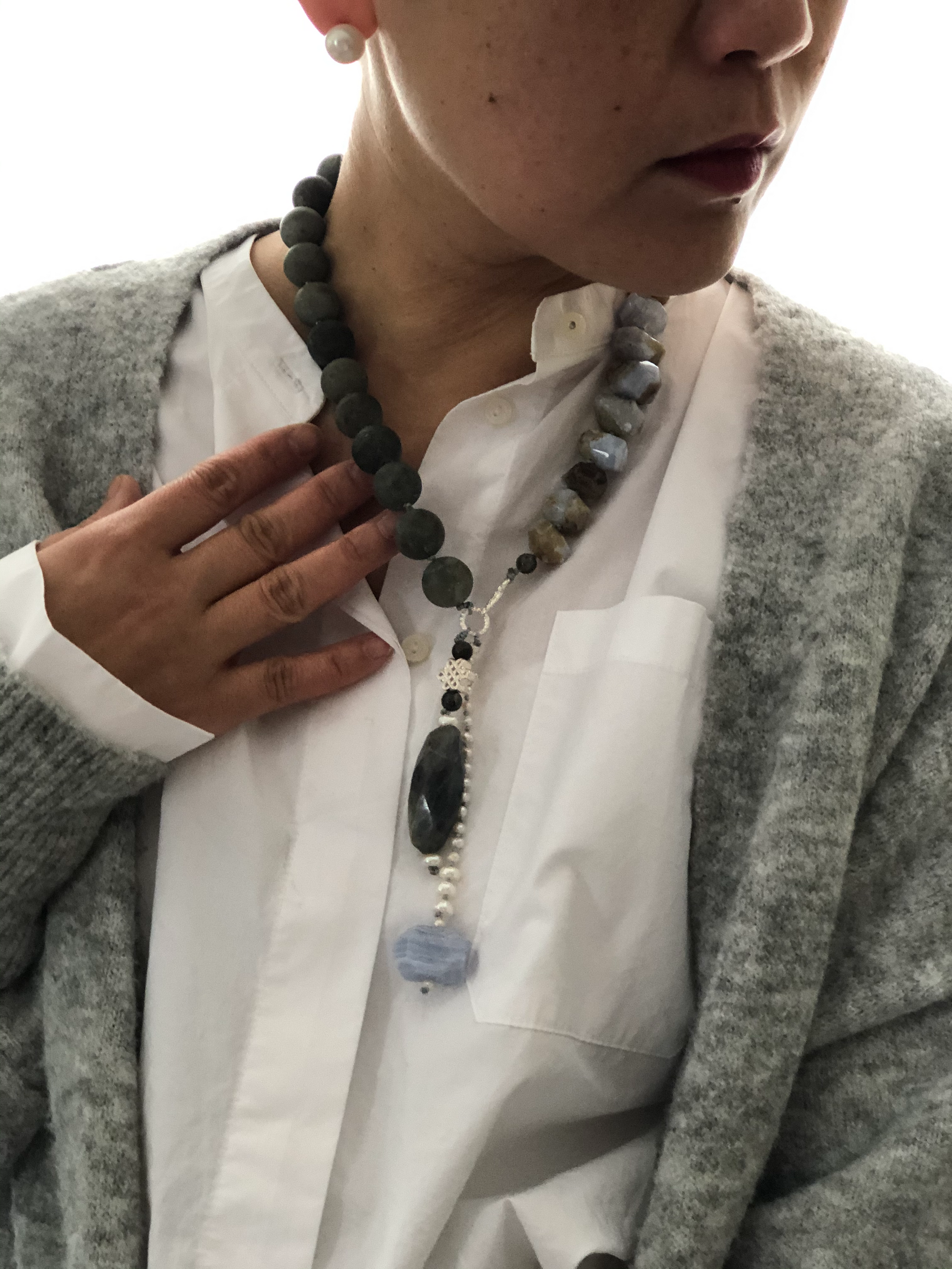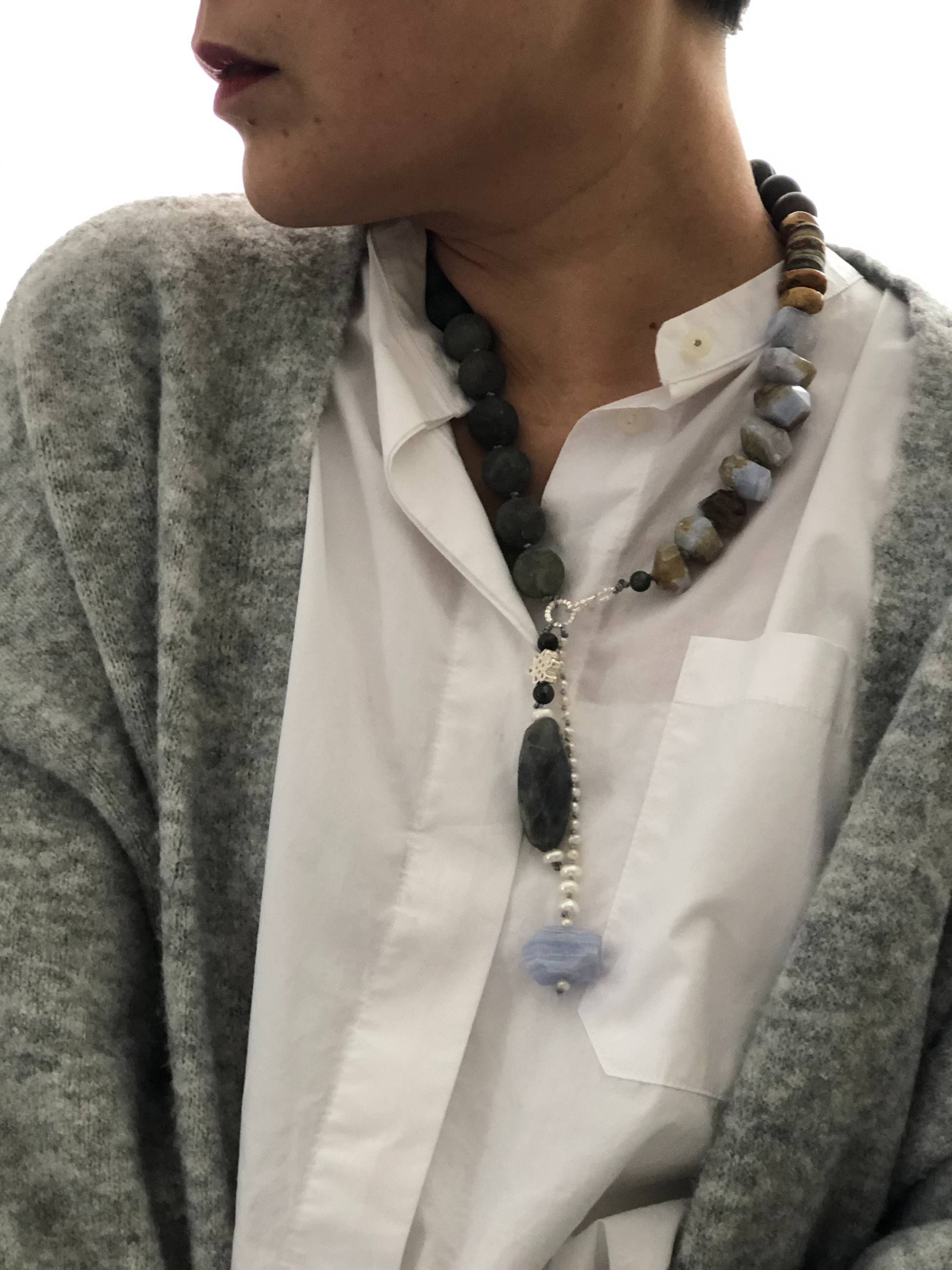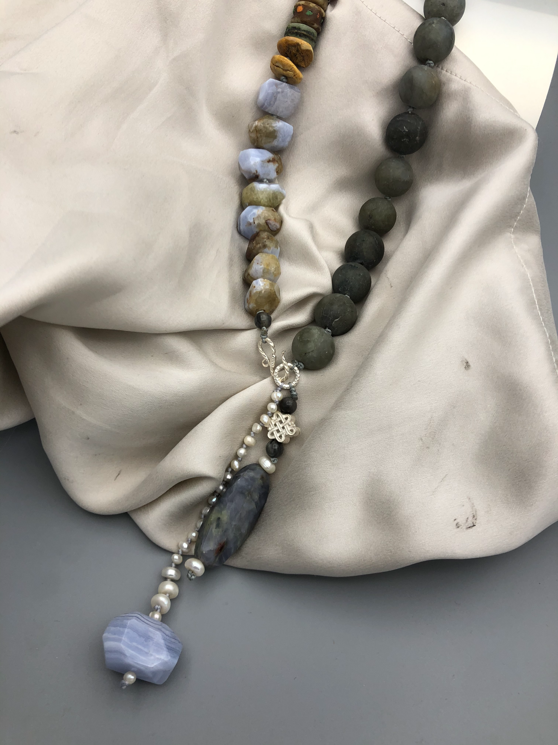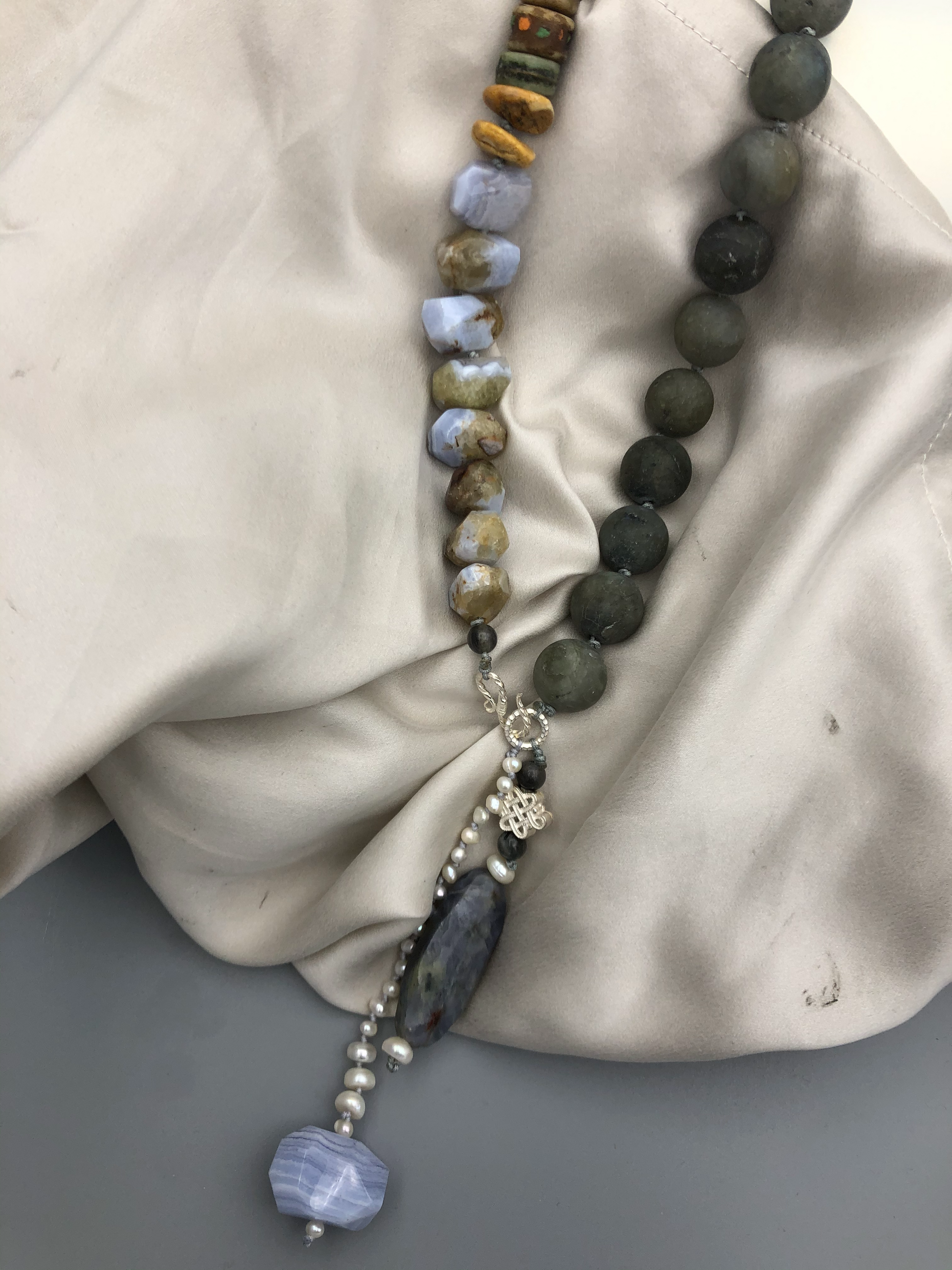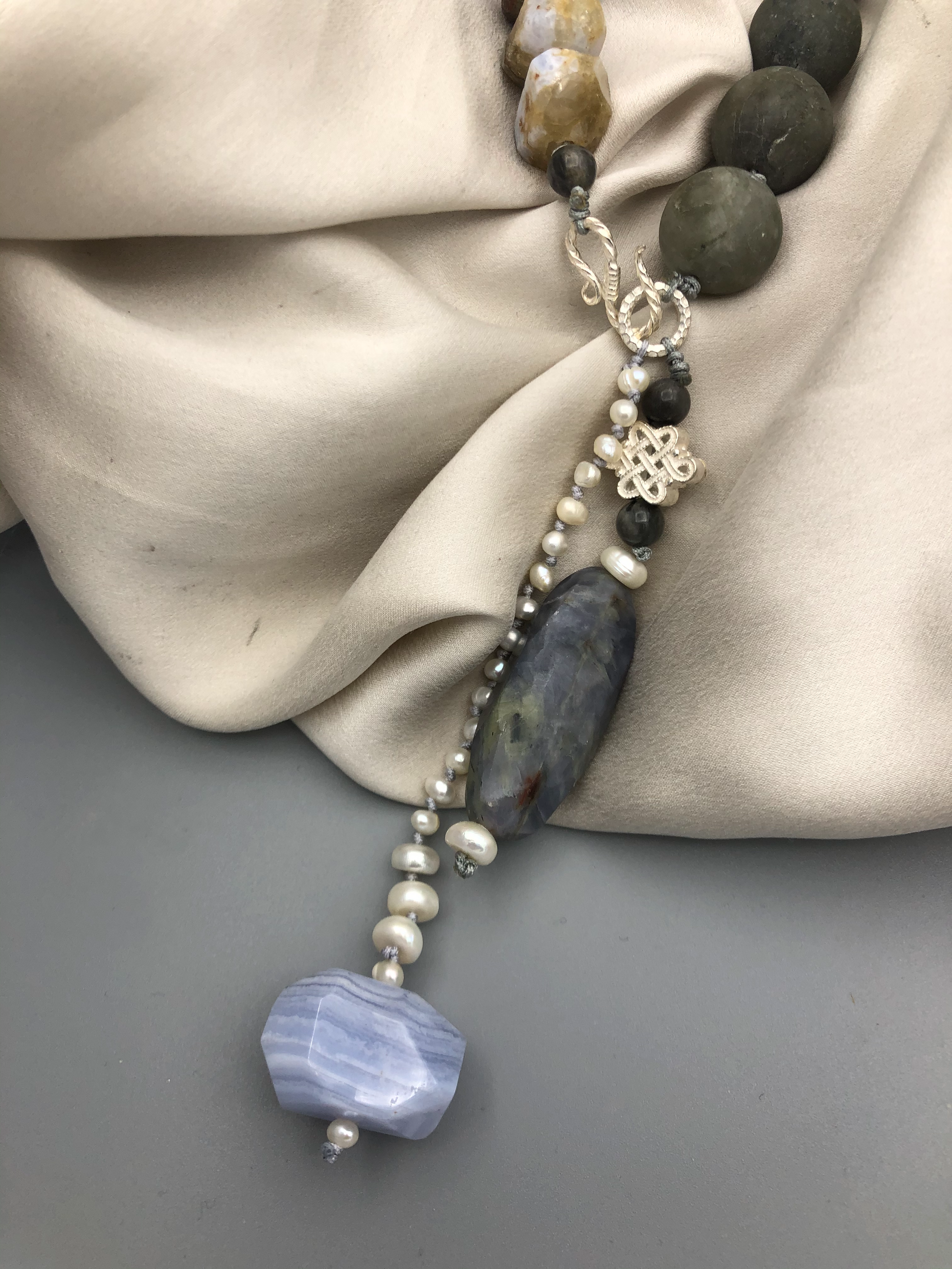 Materials : Blue lace agate, labrodrite, fresh water pearl , fine silver