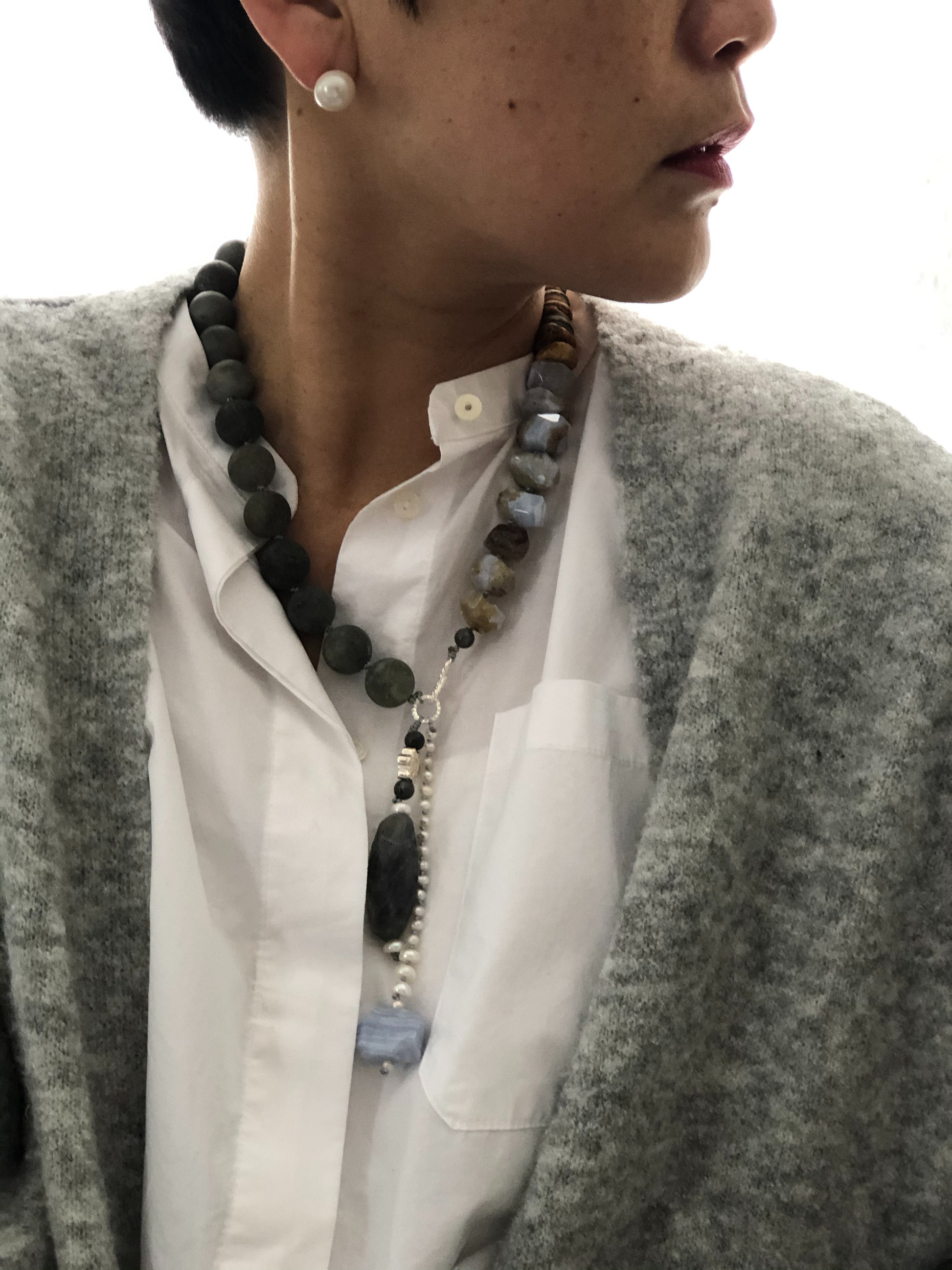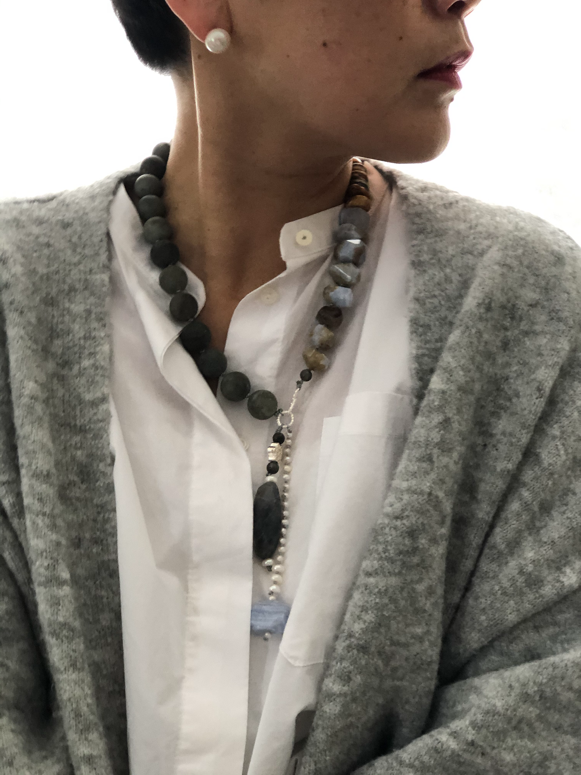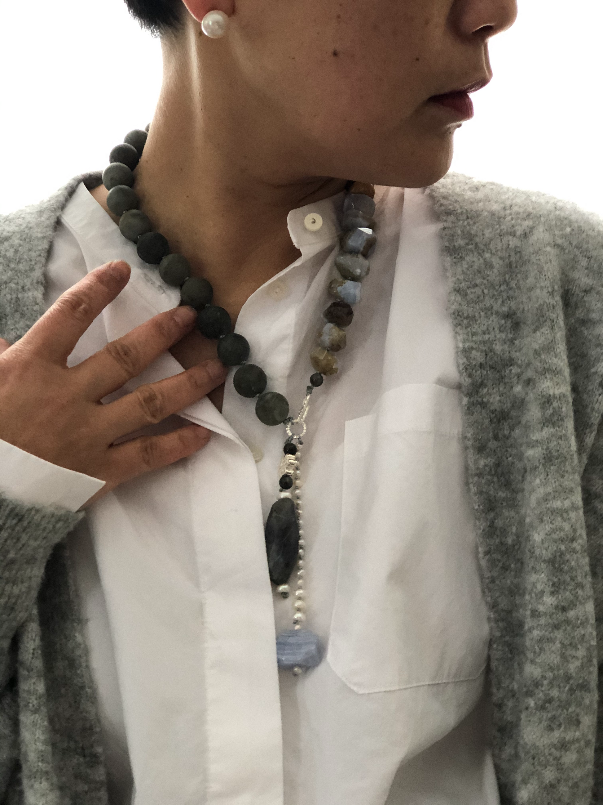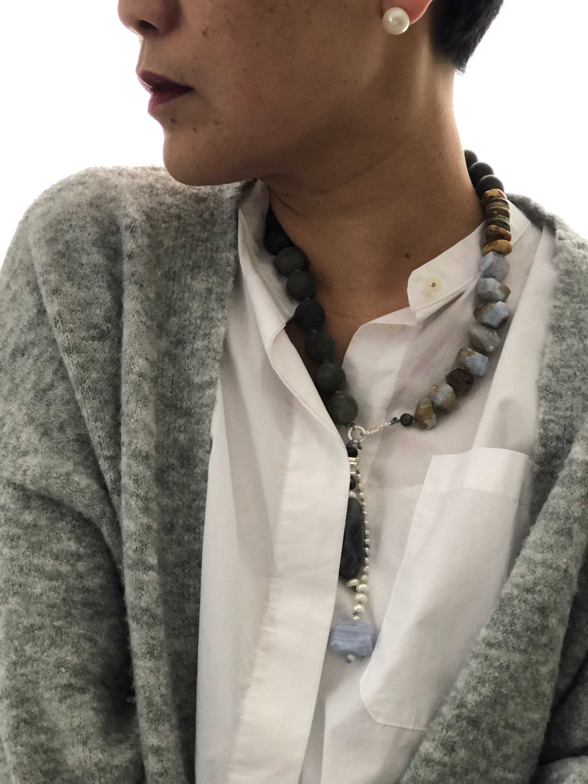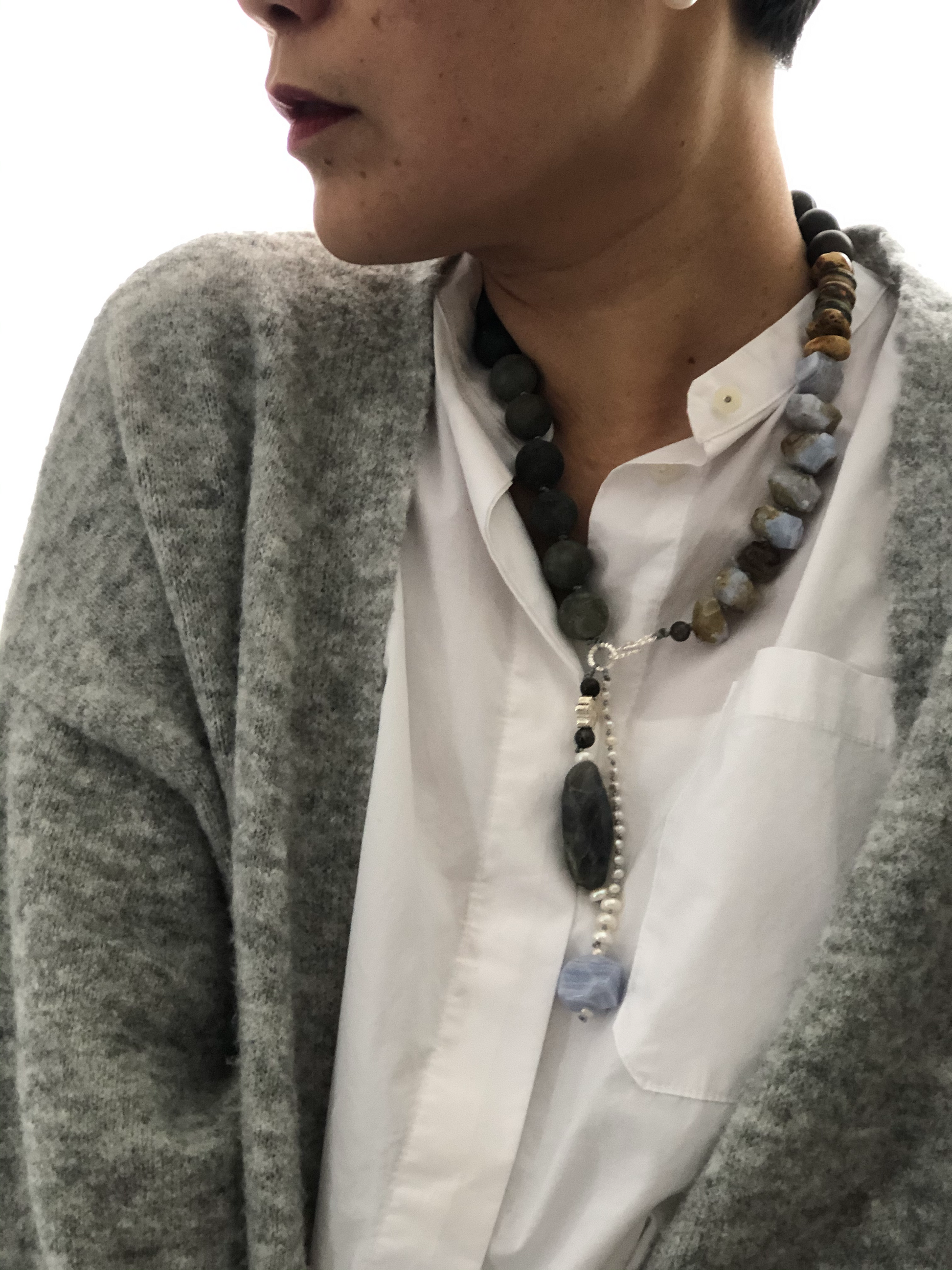 Materials : Blue lace agate, labrodrite, fresh water pearl , fine silver