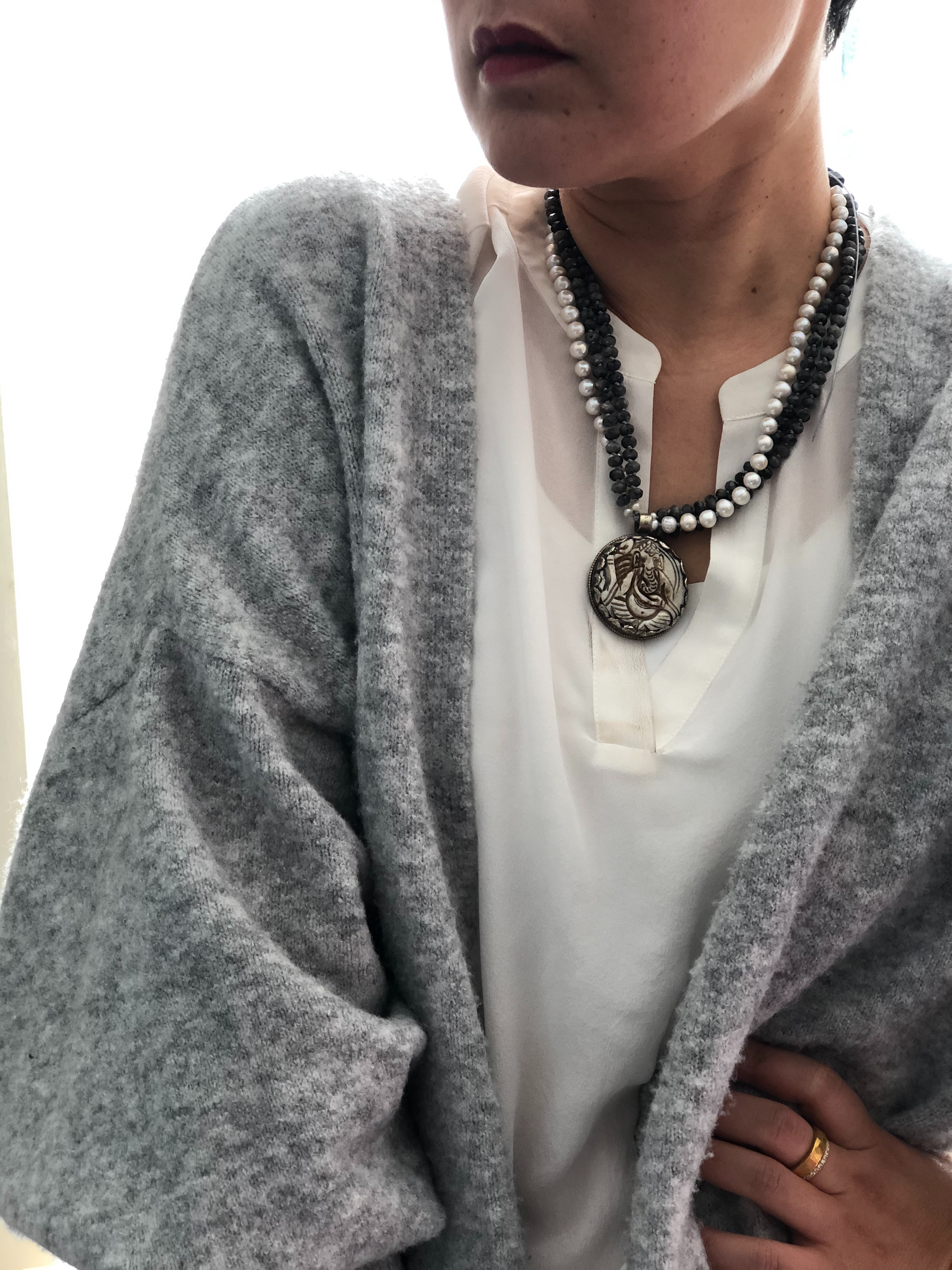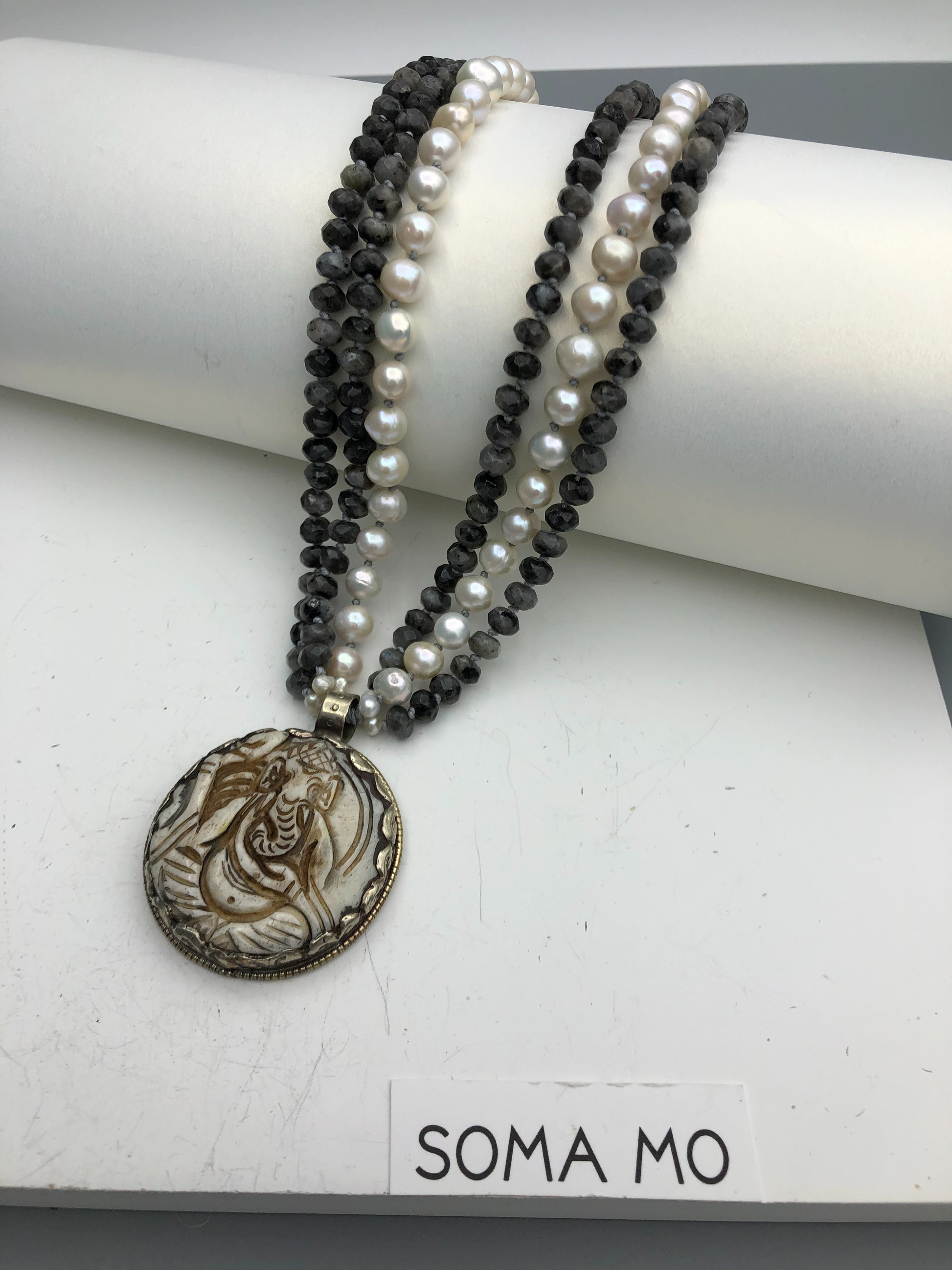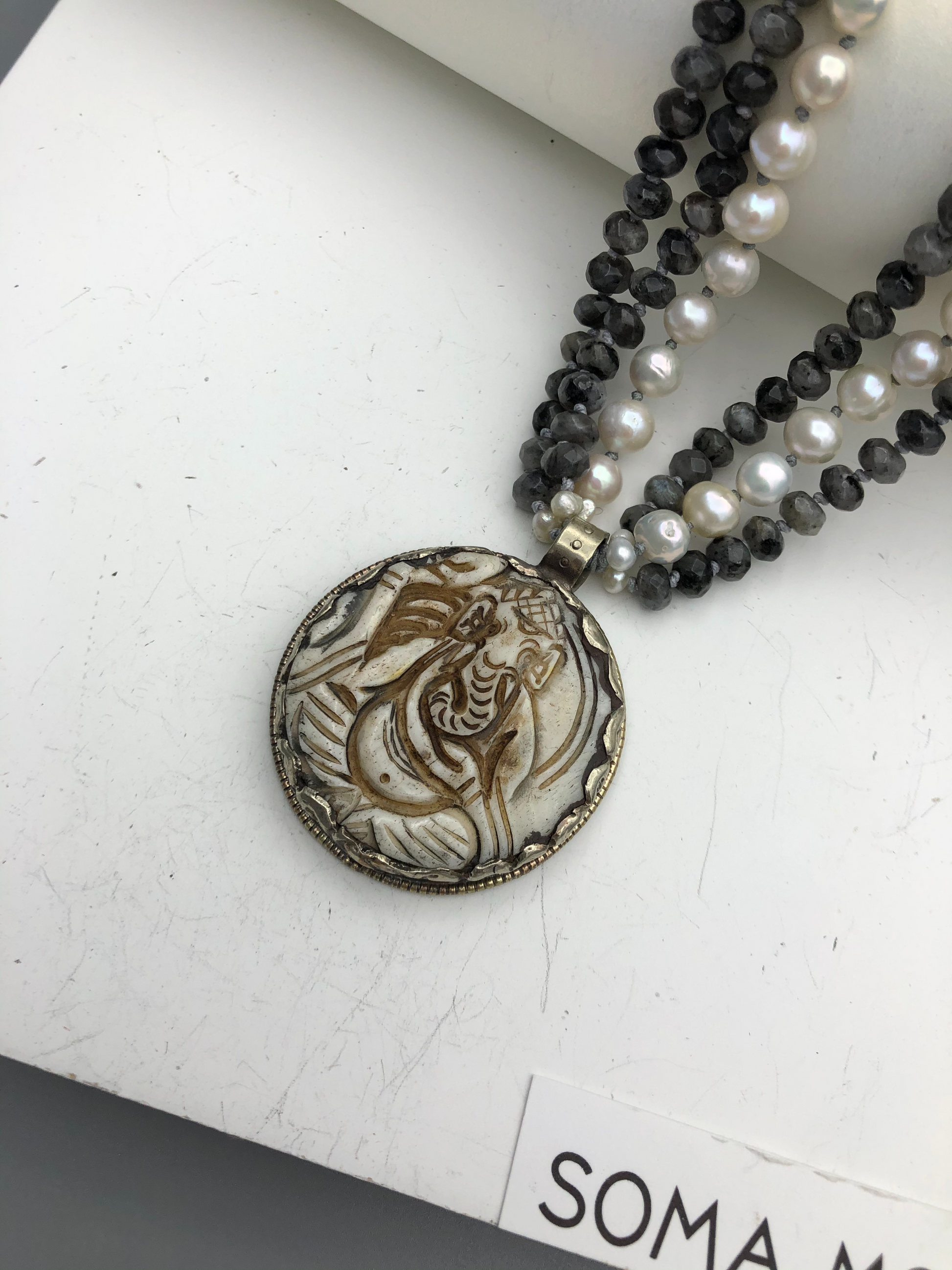 Materials : Grey quartz, fresh water pearl, Tibetan silver pendent with bone