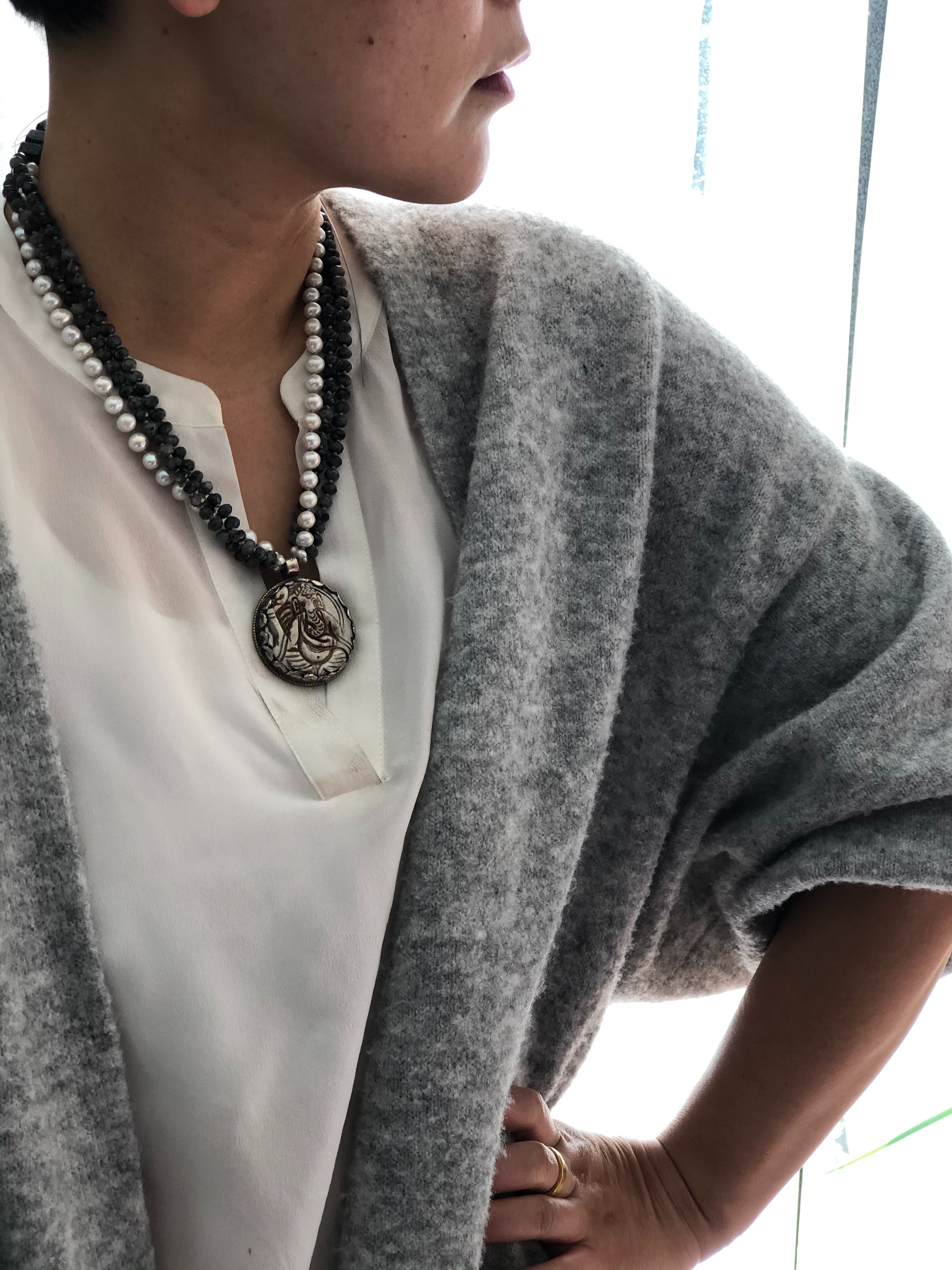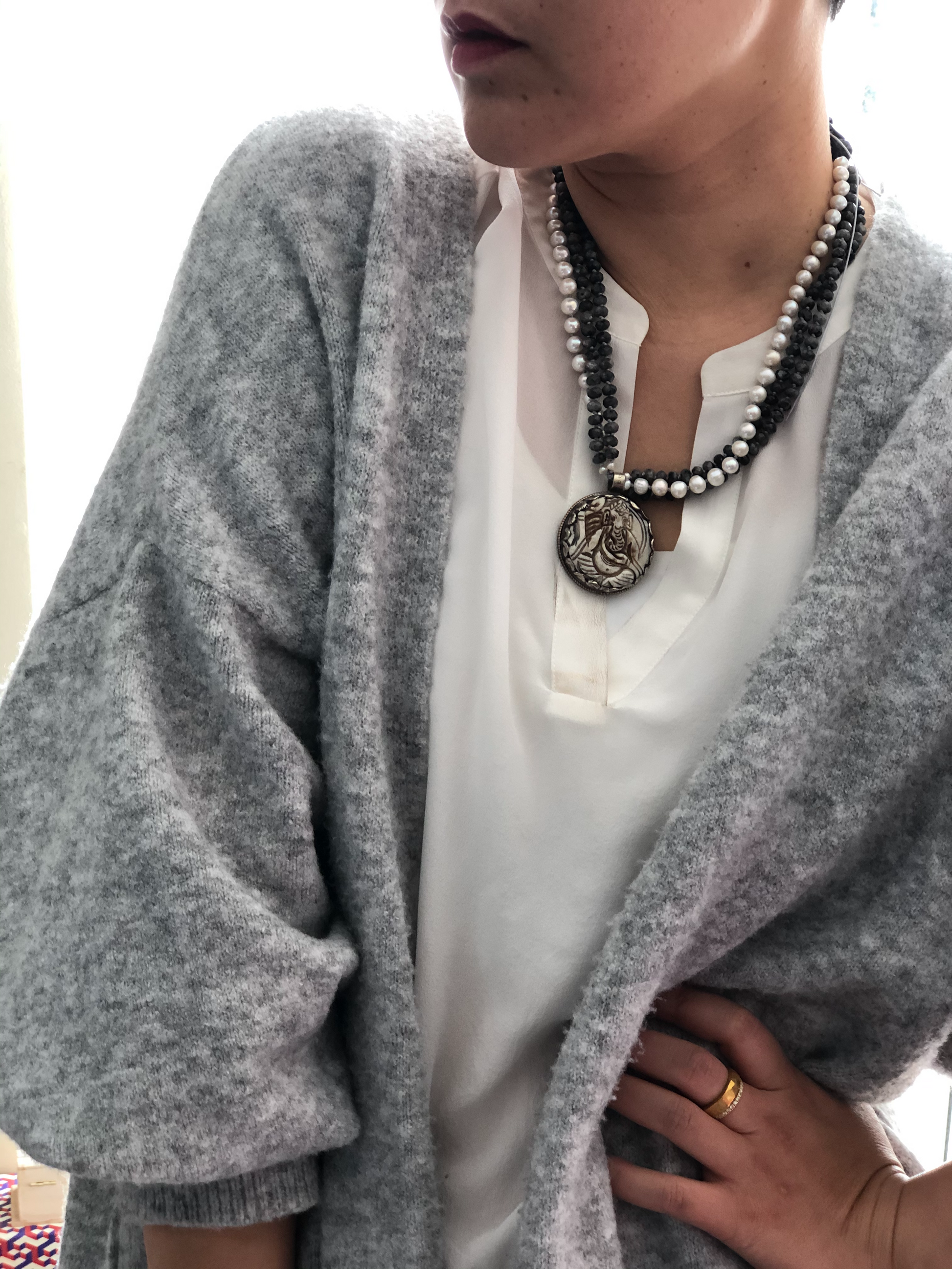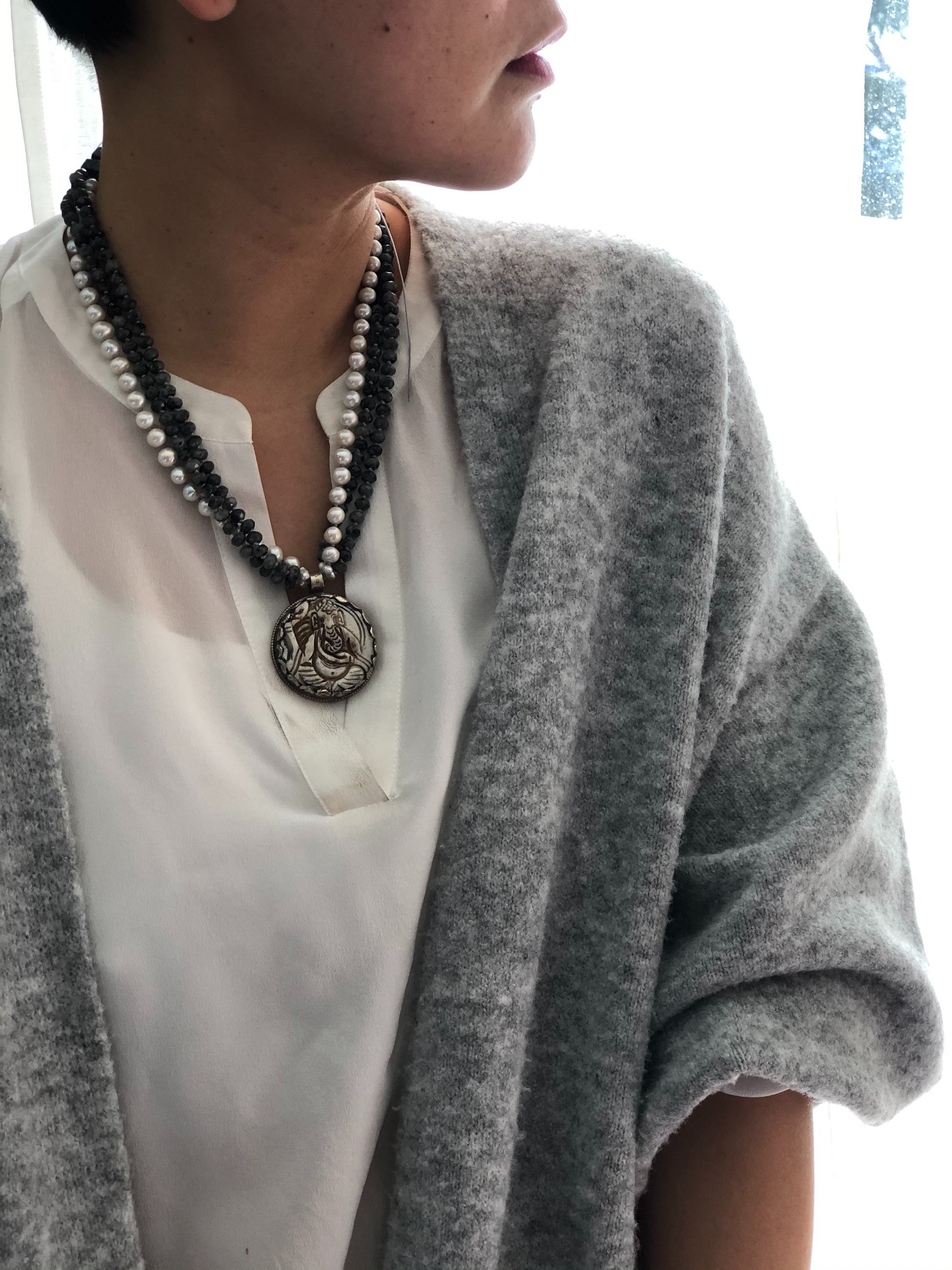 Materials : Grey quartz, fresh water pearl, Tibetan silver pendent with bone