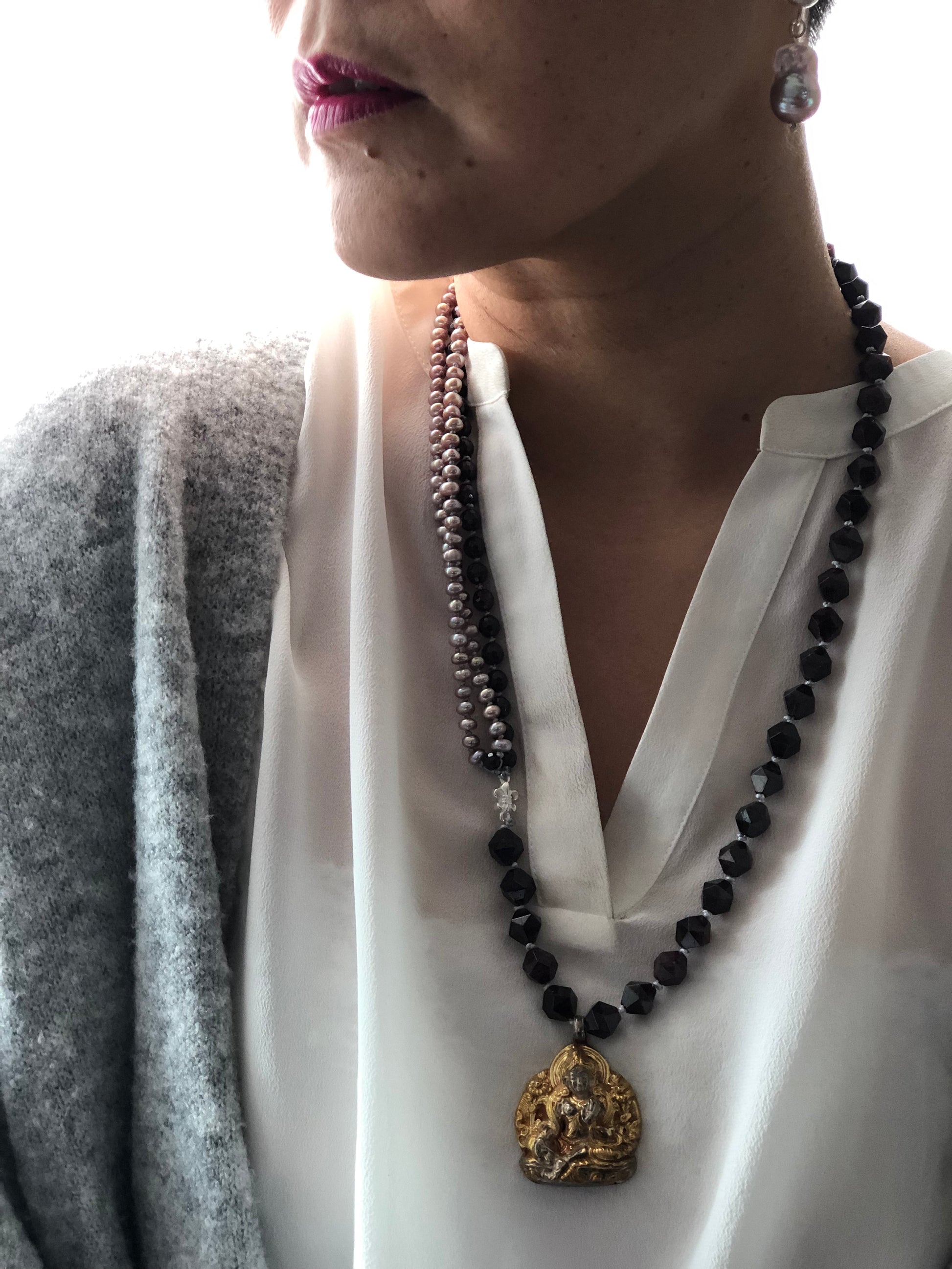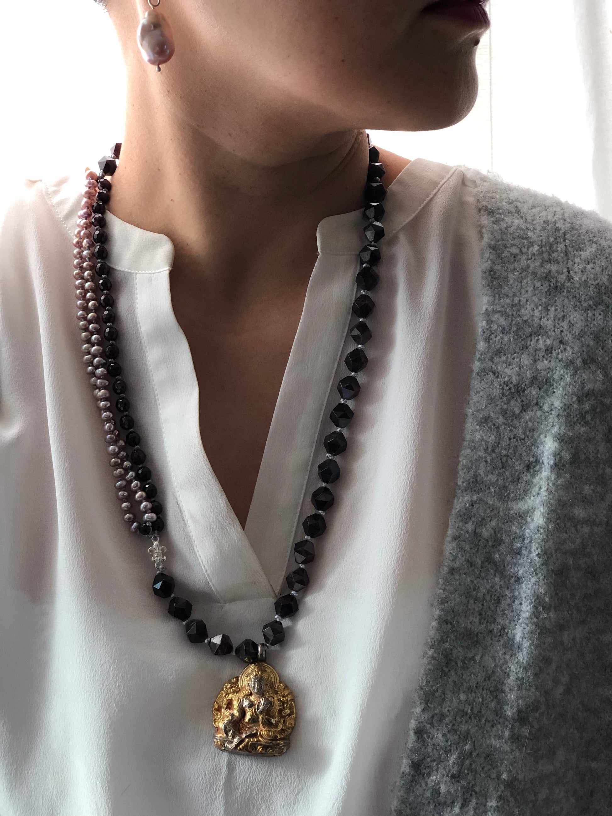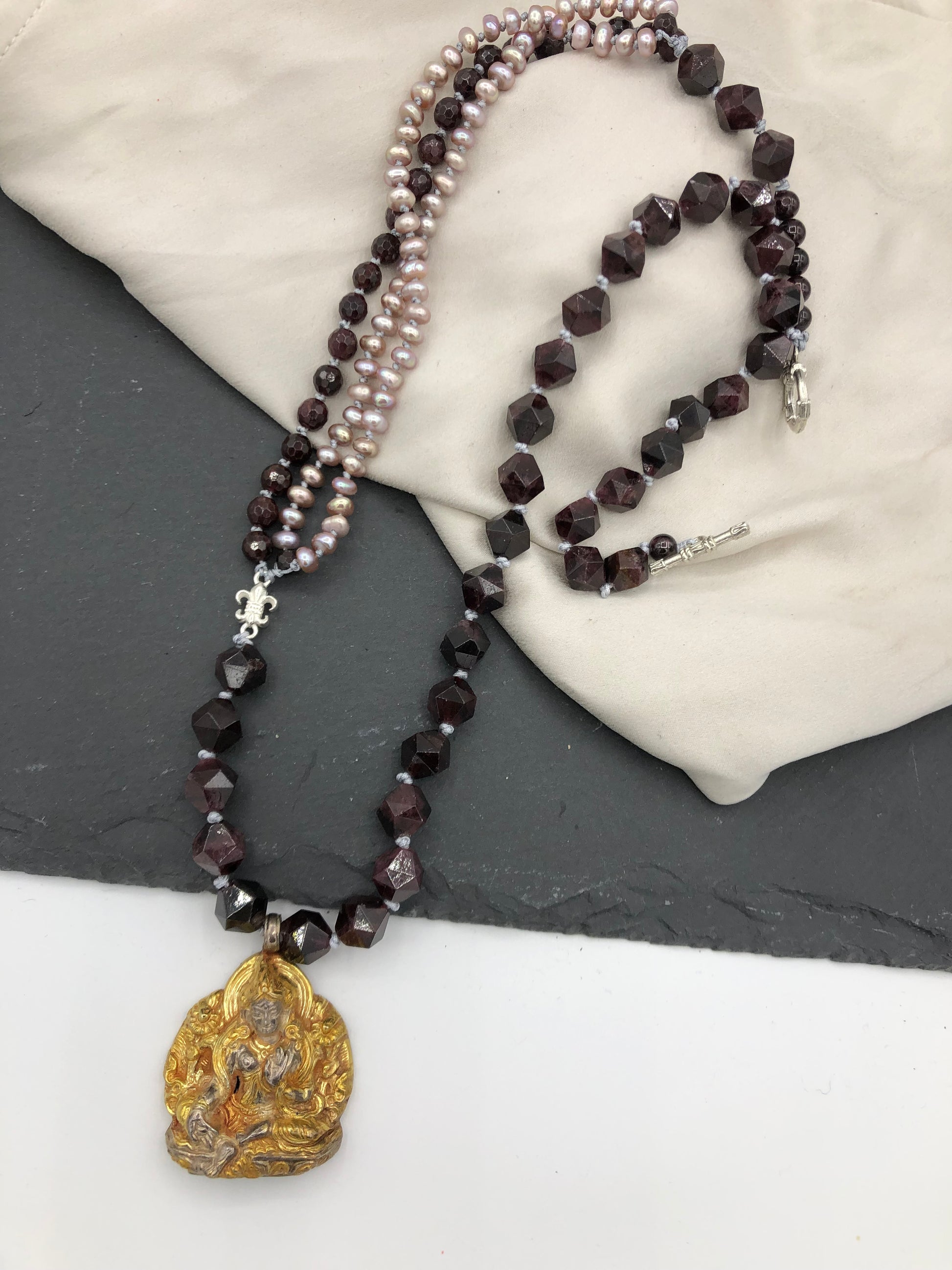 Materials : Garnet, fresh water pearl, old silver pendent