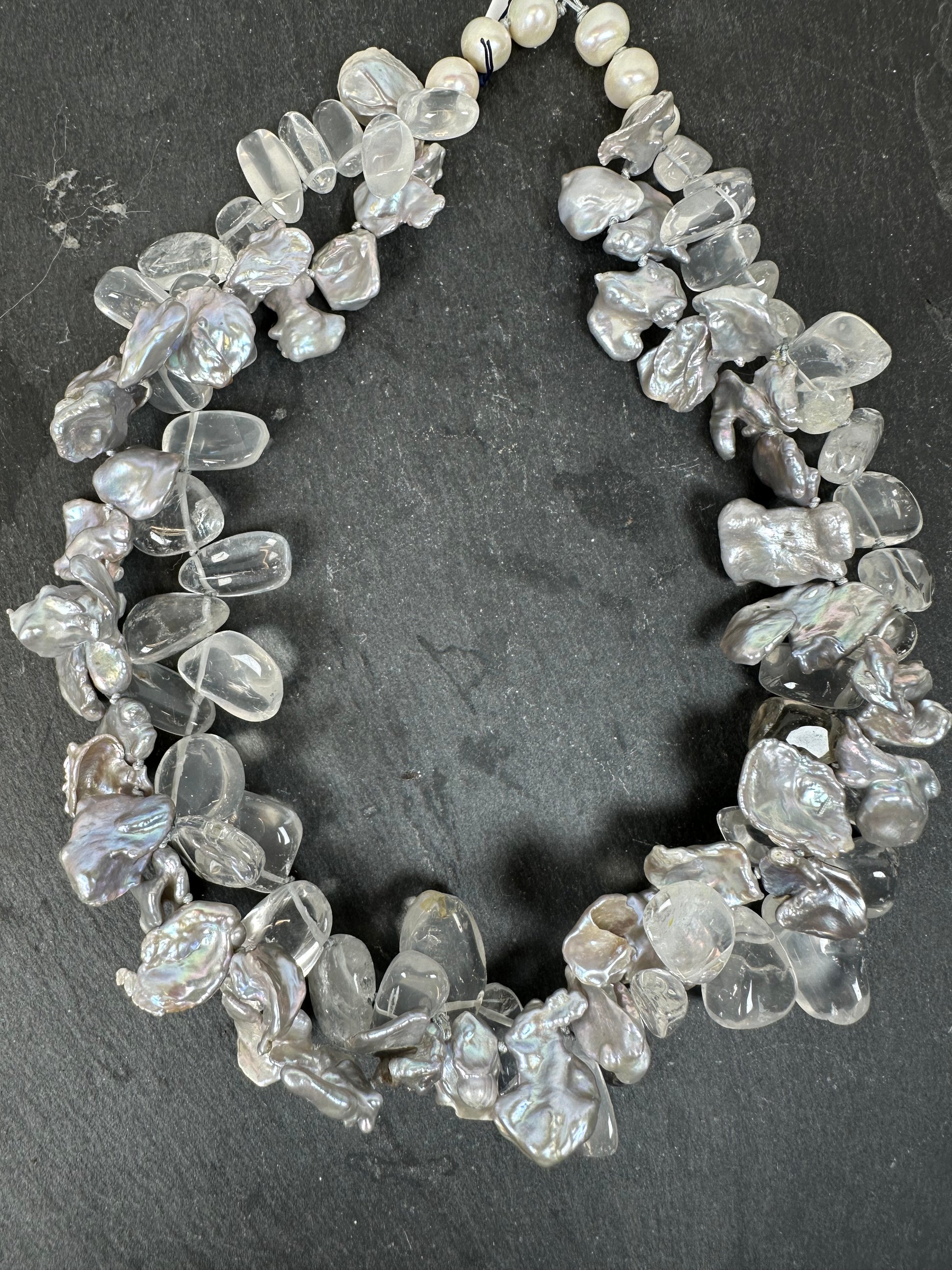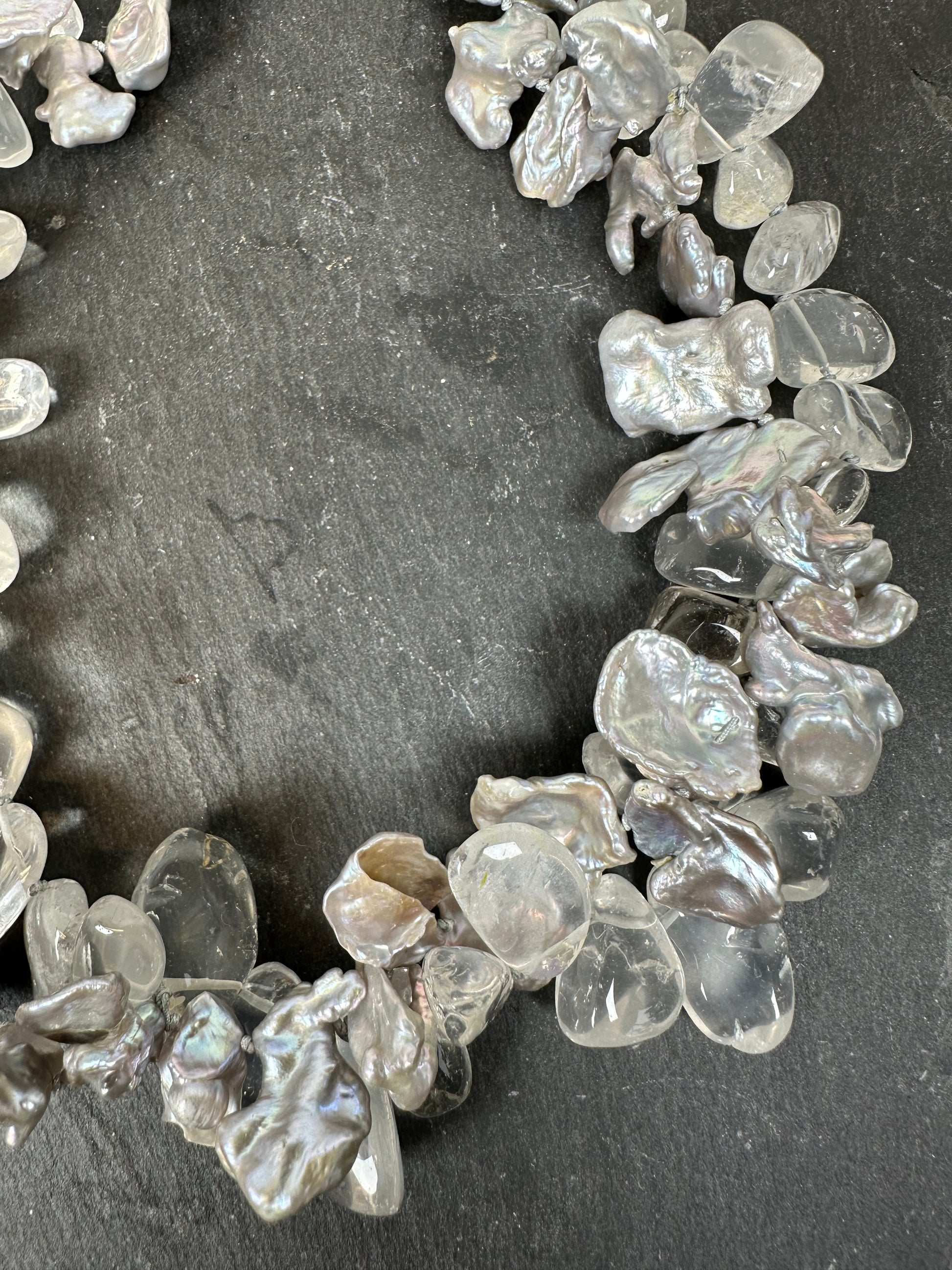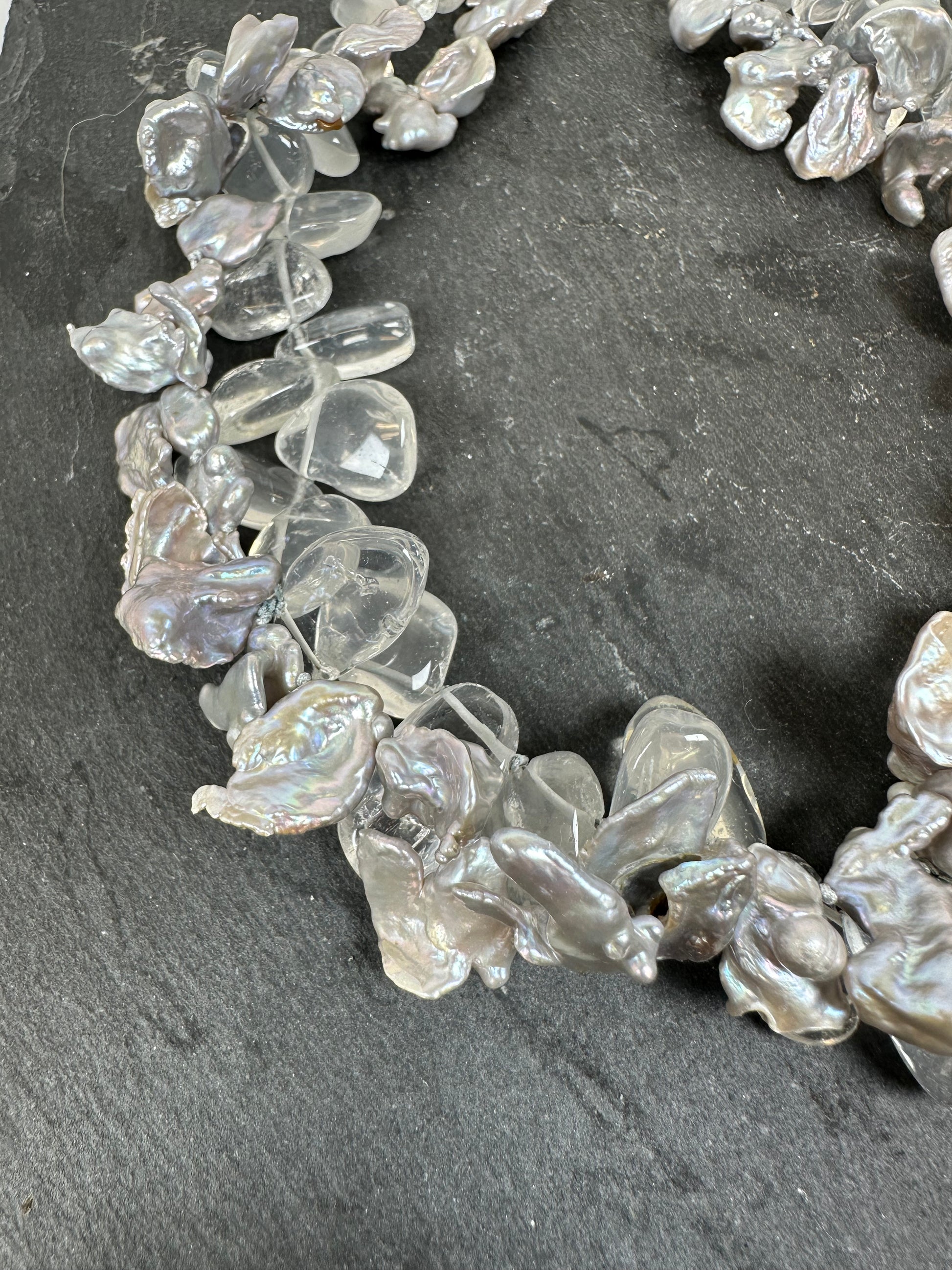 Combination of clear quartz and Keshi pearls. Hand knotted between each beads.
