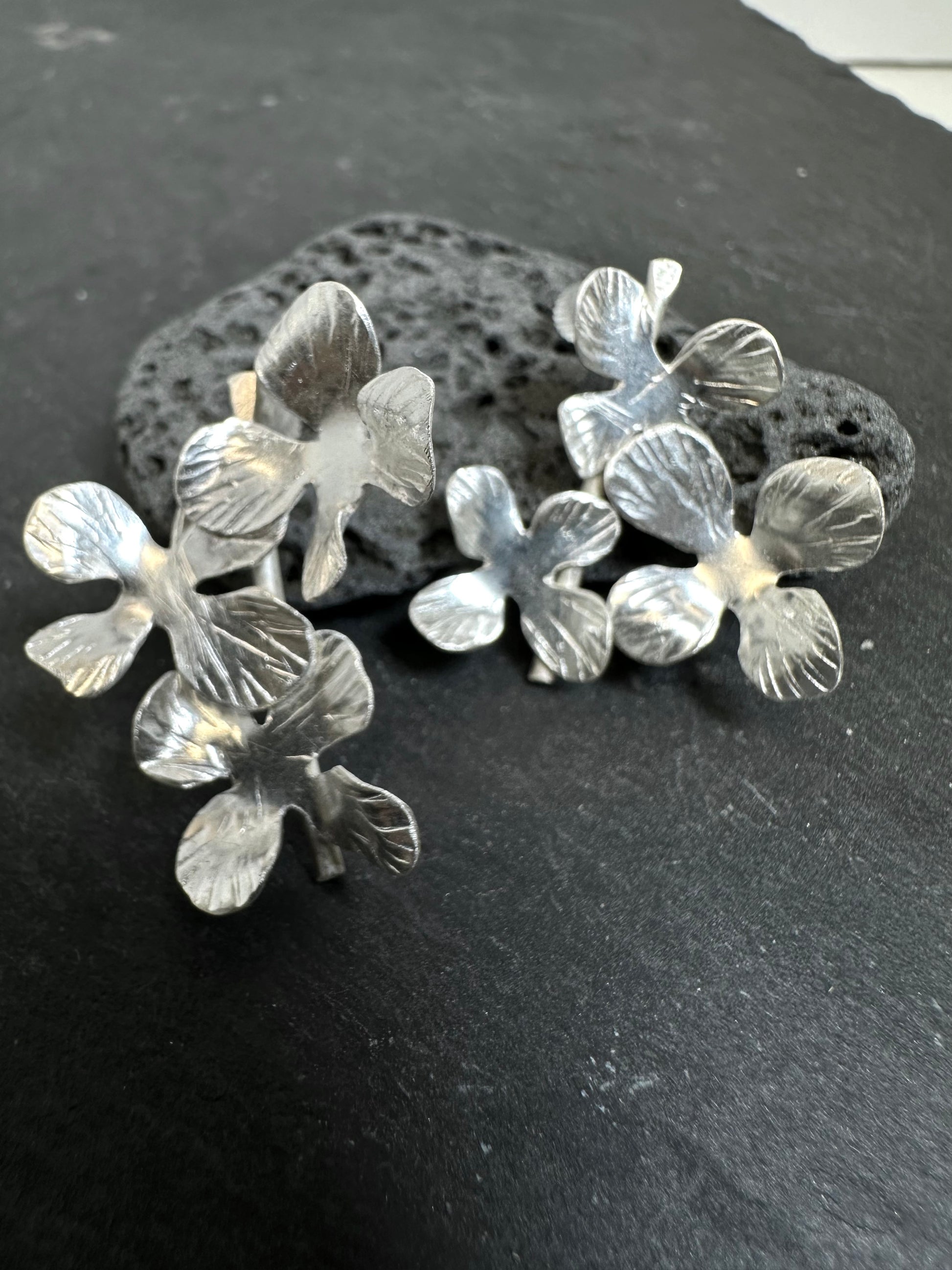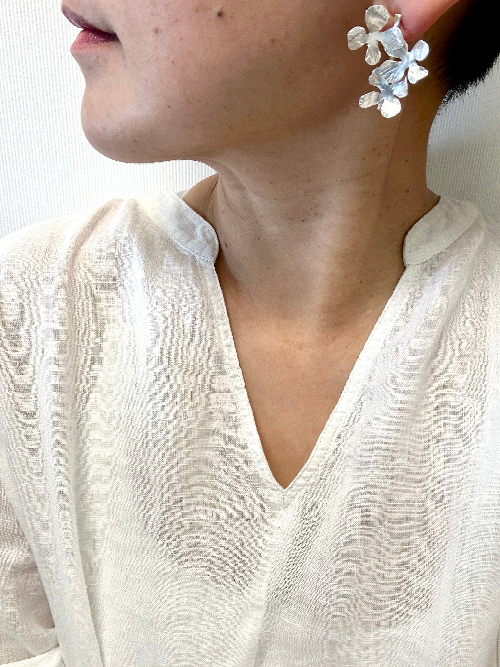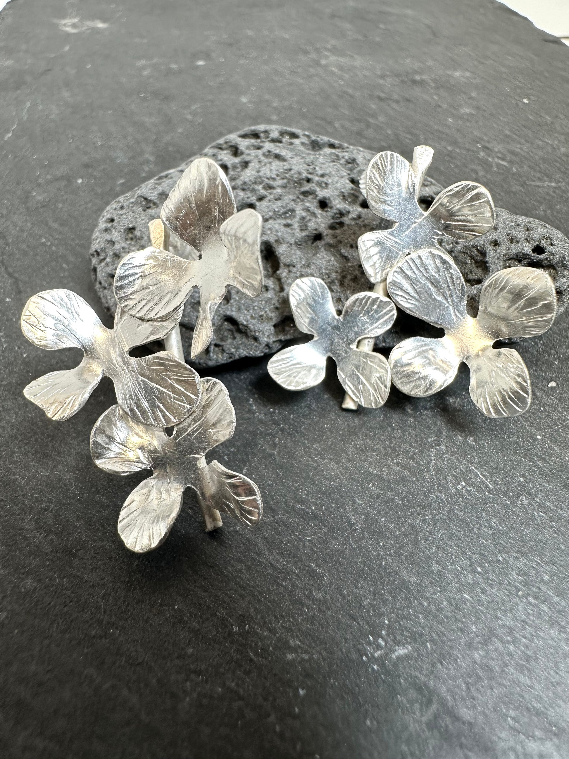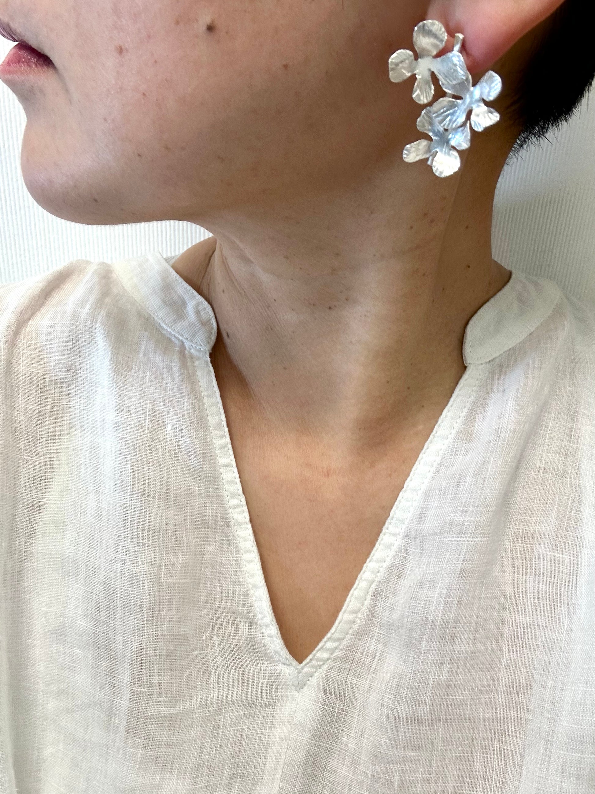 Free hand shaped and hammered on fine silver, traditional Tibetan silver technique , only hand tools used for the earring, each flower is different.